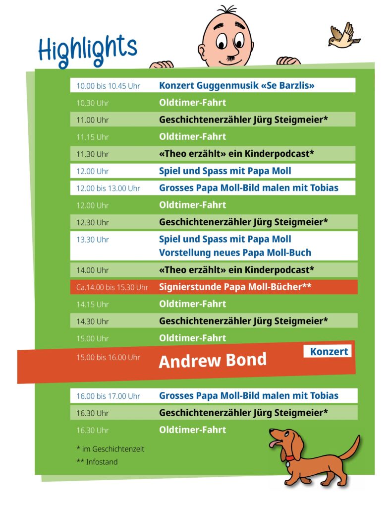 Am Papa Moll-Fest vom 15. September 2024 treten verschiedene Künstler auf, welche wir dir anschliessend kurz vorstellen.